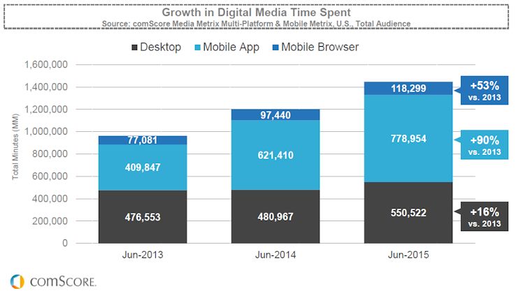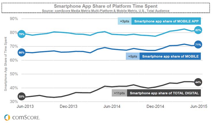 Per this chart, usage in all 3 segments is growing (including desktop), but the growth of time in apps is happening at a far greater rate than any other segment. In addition, time spent on apps exceeds that of time on desktop and the mobile web together. Note that not all app time is on smartphones, as usage in tablets have high app usage as well, but smartphone app usage by itself represents 44% of all digital media time spent: