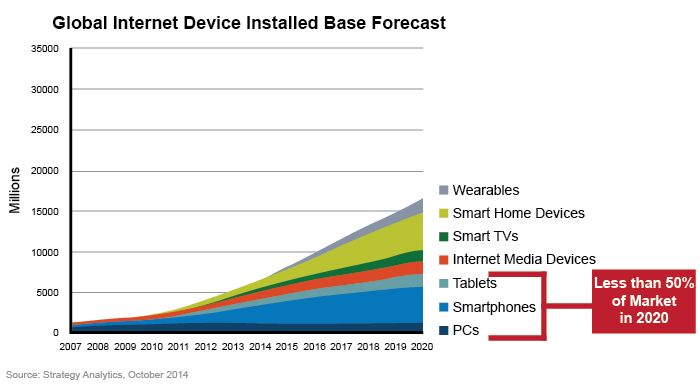 According to this data, PCs, tablets, and smartphones will only be about 25% of the installed Internet-enabled devices by 2020. Just a few years ago, these represented two-thirds of the installed Internet devices. In the biz world, this is what we call a "disruptive change."