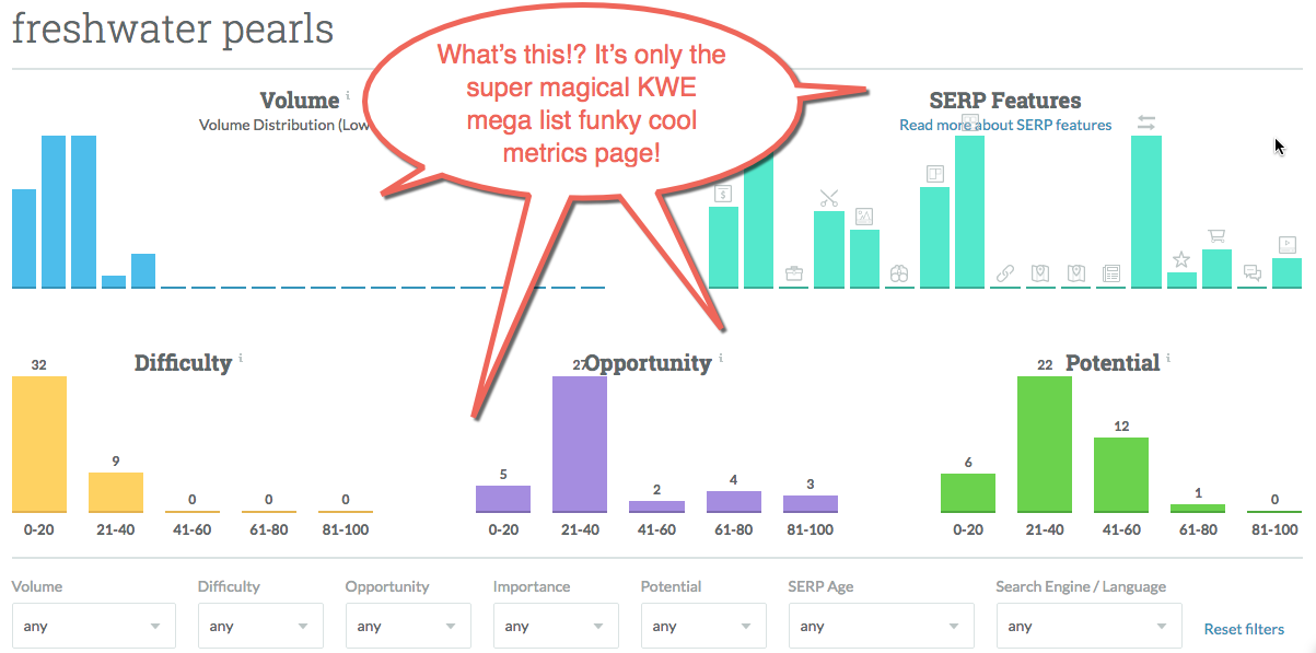 It’s well worth the sign-up; not only to you get 5,000 keyword reports per month and 30 lists (on the Medium plan), but you also get to check out the super-magical-KWE-mega-list-funky-cool metric page. That’s what I call it, just rolls off the tongue, you know?