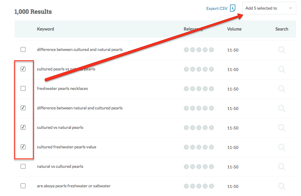 Well, hi there, ever-expanding long tail! We’ve gone from a handful of keywords pulled together manually from different sources to 1,000 suggestions right there on your screen. Positioned right next to that we have search volume to give us an idea of demand.