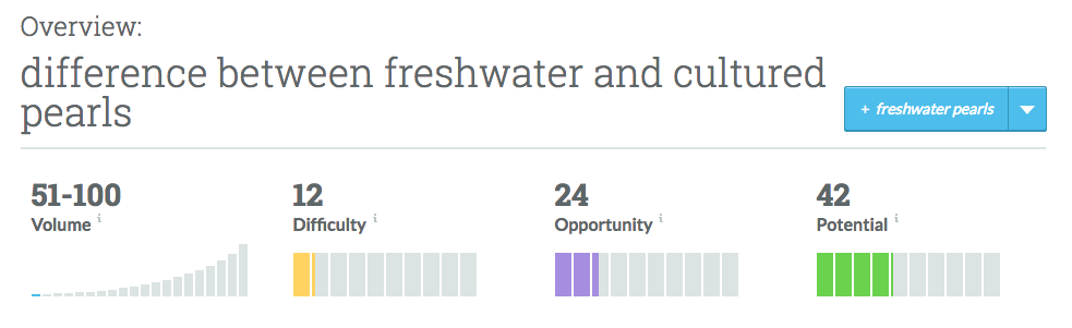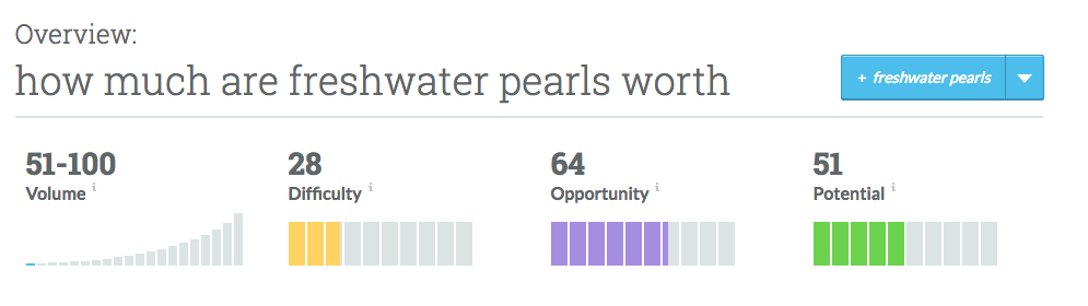 Search volume is the same, but for the keyword how much are freshwater pearls worth Difficulty is up, but so is the overall Potential because the Opportunity is higher.