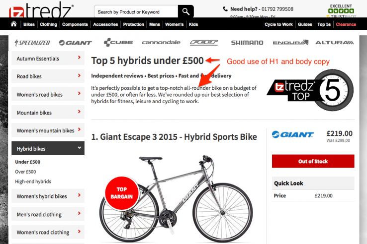 Below is the page for the "Top 5 hybrids for under £500." You can clearly see how the URL (http://bit.ly/294d8wZ), meta, H tags, and body copy all support this focus and are consistently aligned: