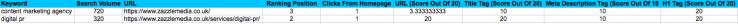 This outputs a spreadsheet that scores each URL or even categories of URLs (to allow you to see how well-optimized the site is generally for a specific area of business, such as Apple laptops), enabling you to sort the data, discover the pages most in need of improvement, and identify where content gaps may exist.