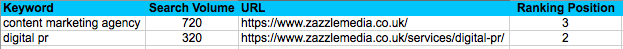 We start by adding our keywords to our spreadsheet alongside a capture of the search volume for those terms and the actual URL ranking, as shown below (NOTE: all data is for google.co.uk).