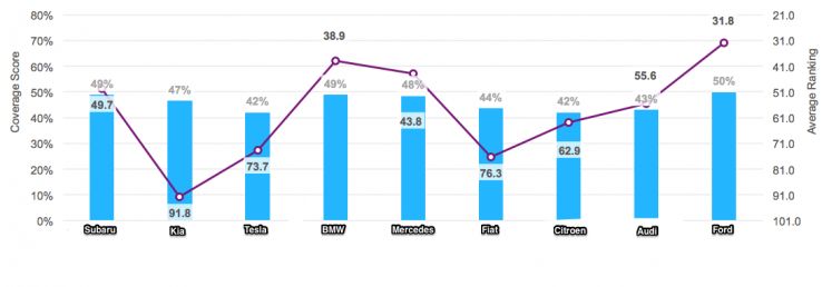 Here's an example of the corresponding chart for the table shown above, showing performance by category and ranking correlation. We're using dummy data here, but you can look at the overall optimization score for each car brand section alongside how well they rank (the purple line is average rank for that category):