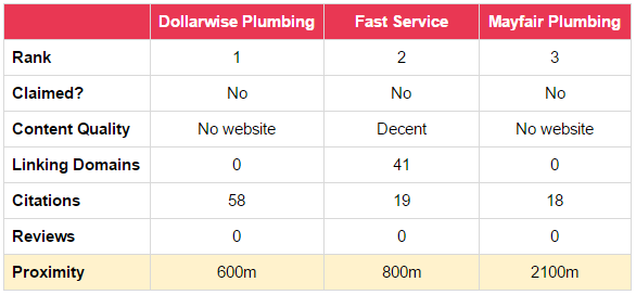 Here’s a quick summary of the basic local ranking factors for the businesses in this local pack: