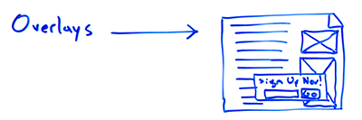 When we're talking about a pop-up that happens in the same browser window, essentially it's just a visual element, that's often also referred to as an overlay. So, for the purposes of this Whiteboard Friday, we'll call that an overlay. An overlay is basically like this, where you have the page's content and there's some smaller element, a piece, a box, a window, a visual of some kind that comes up and that essentially says, maybe it says, "Sign up for my email newsletter," and then there's a place to enter your email, or, "Get my book now," and you click that and get the book. Those types of overlays are pretty common on the web, and they do not create quite the same problems that pop-ups do, at least from Google's perspective. However, we'll talk about those later, there are some issues around them, especially with mobile.