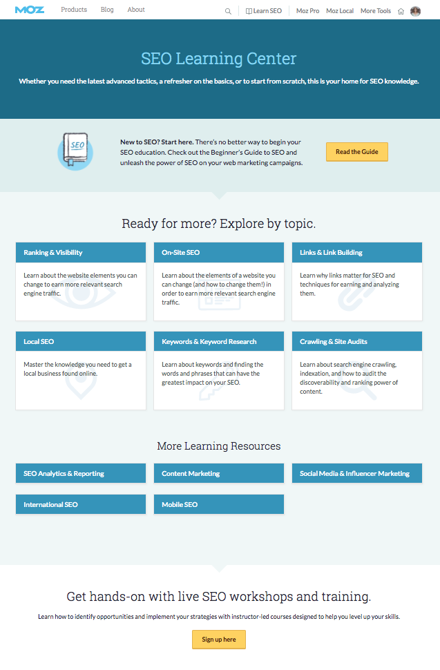 Offshoots like the Local Learning Center and Content Marketing Learning Center sprung up in an effort to tame the overgrown learning hub, but ‘twas all for naught: By autumn of 2016, Moz’s learning hub sites were a confusing nest of hard-to-navigate articles, guides, and 404s. Some articles were written for SEO experts and explained concepts in extensive, technical detail, while others were written for an audience with less extensive SEO knowledge. It was impossible to know which type of article you found yourself in before you wound up confused or discouraged.