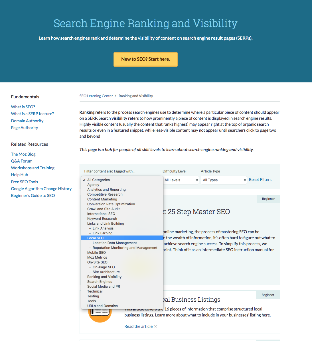 All eleven of the hubs contain a “fundamentals” menu to help you wrap your brain around a topic, as well as a content feed with hundreds of resources to help you go even further. These feed resources are filterable by topic (for instance, content that’s about both ranking & visibility AND local SEO), SEO skill level (from beginner to advanced), and format.
