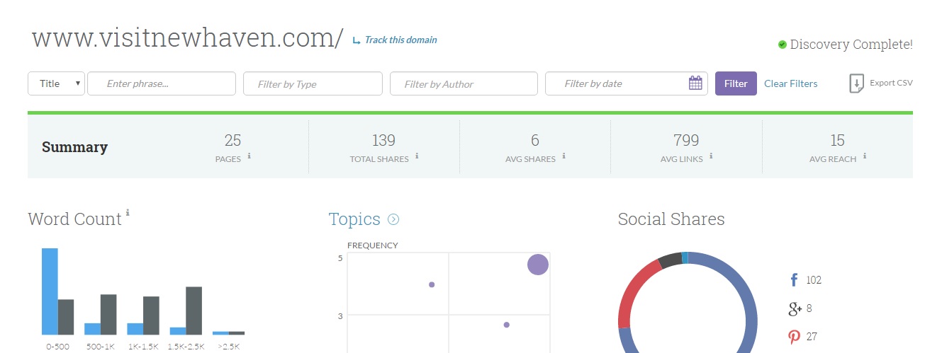 The first site I analyzed was VisitNewHaven.com. It’s full of tourist information, meaning it probably has a good handle on why people enjoy New Haven, and it knows what they like about it.
