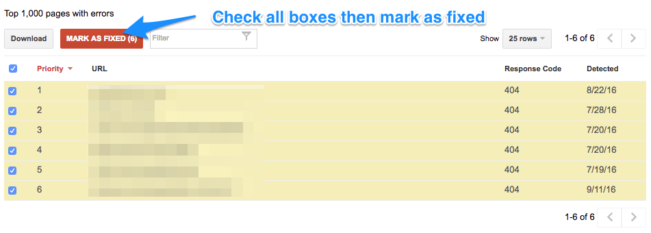 If you’ve made some drastic changes to your site to fix errors, or believe a lot of the URL errors are no longer happening, one tactic to employ is marking all errors as fixed and checking back up on them in a few days.