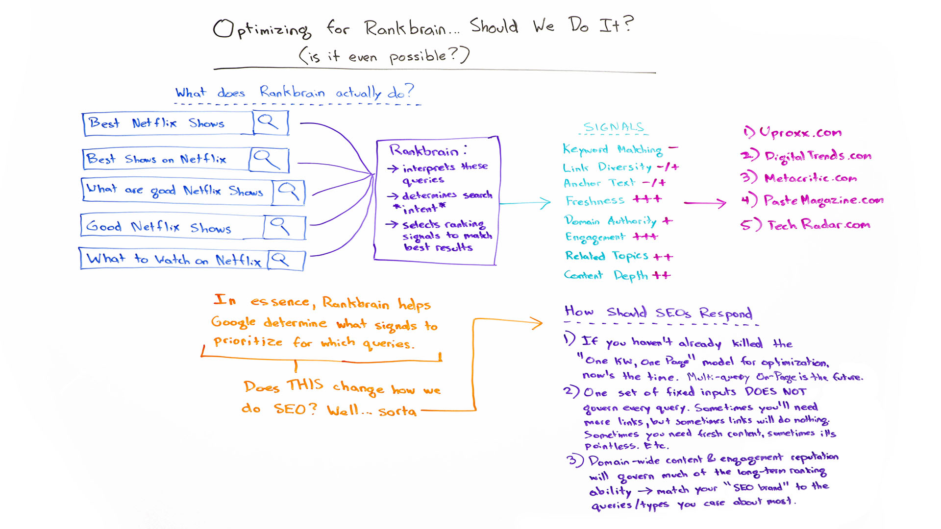Now, RankBrain is going to help Google understand that each of these queries, despite the fact that they use slightly different words and phrasing or completely different words, with the exception of Netflix, that they should all be answered by the same content or same kinds of content. That's the part where Google, where RankBrain is determining the searcher intent. Then, Google is going to use RankBrain to basically say, "Now, what signals are right for me, Google, to enhance or to push down for these particular queries?"