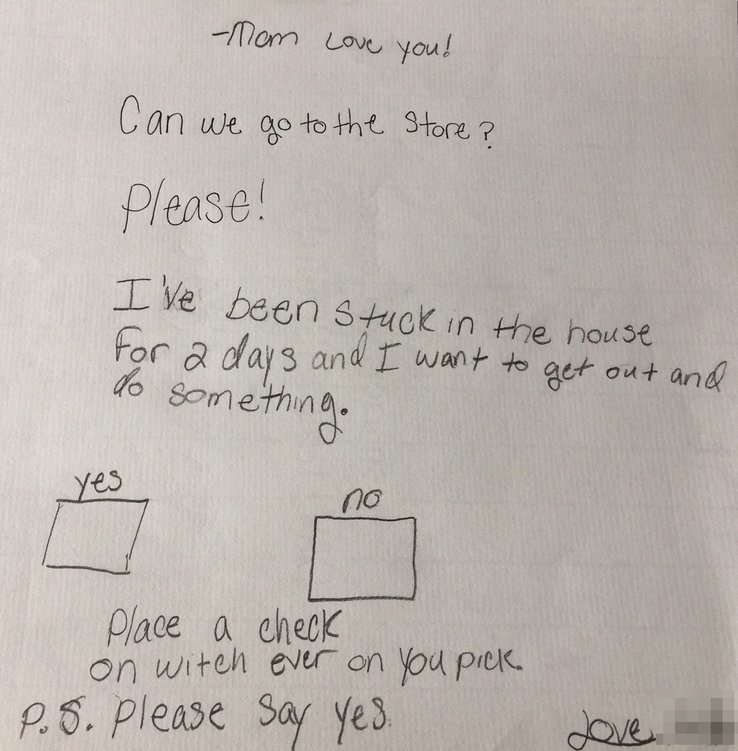 During the holidays, my youngest daughter apparently had cabin fever after being in the house for a couple of days. While exiting the bedroom, my wife found the note below on the floor, after the former had slyly slid it under the door.